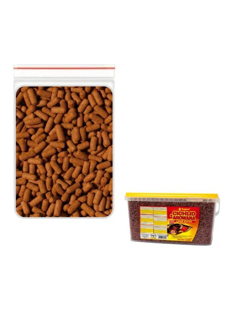 Tropical Cichlid Arowana Large Sticks, Arowana türü balıklar için renk arttırıcı stick formunda balık yemi. Yumuşak yapısı sayesinde sindirimi kolaydır. Zengin formülü, Arowana türlerinin ( hem otobur hem de etobur ) tüm beslenme ihtiyaçlarını karşılar. Günlük olarak, gerektiğinde diğer sebze ve renk arttırıcı gıdalarla desteklenen temel bir gıda olarak kullanılabilir.