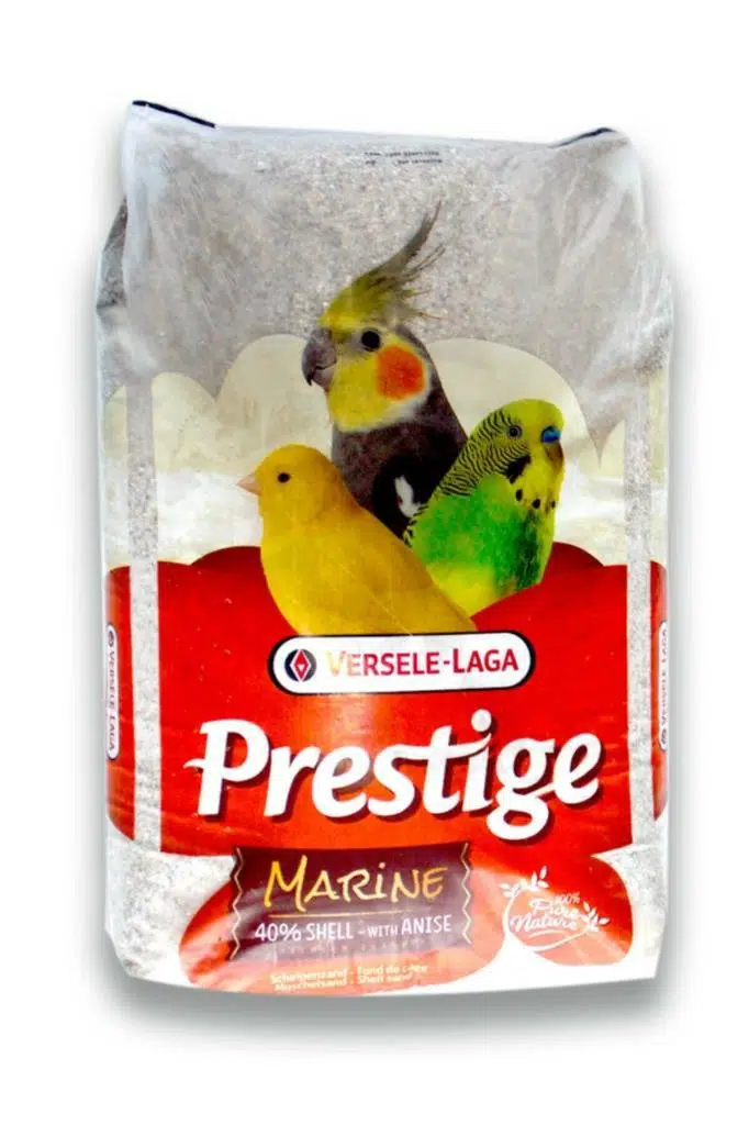 Versele Laga Prestige Premium Marine kuş kumu istiridye kabuğu ve anason içerir. Ürünün P ' si istiridye ve midye kabuğu kırığı ve minerallerden